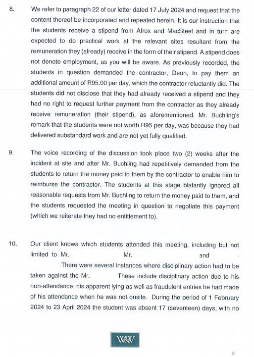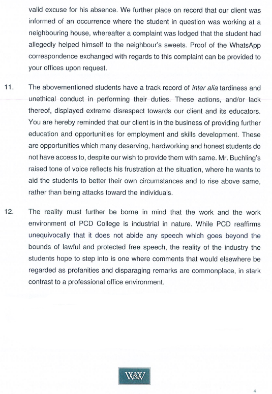 In response to various media enquiries by this publication, the letter forms part of the responses from Cloete on behalf of PCD College.